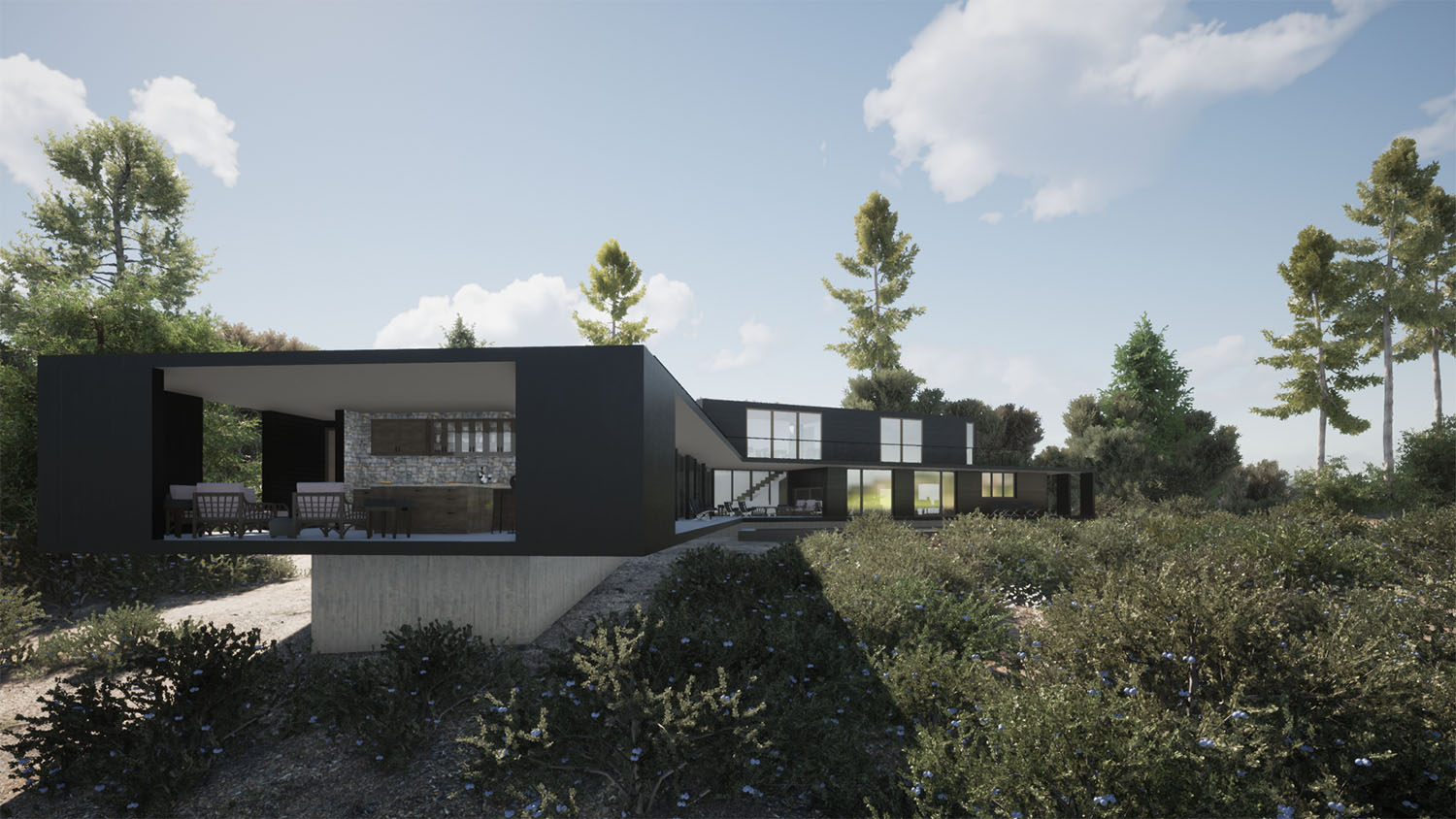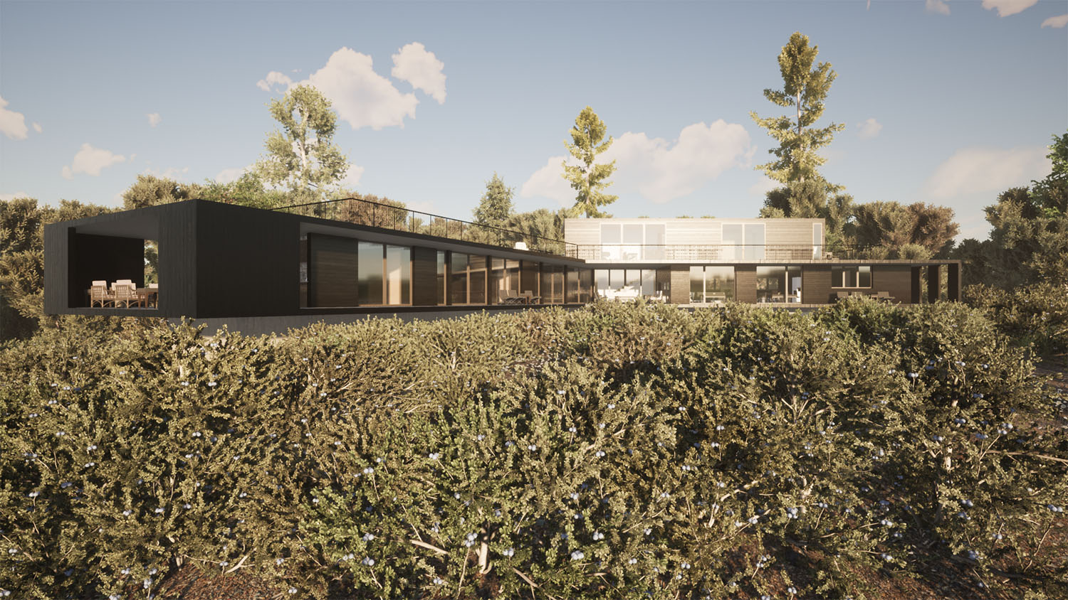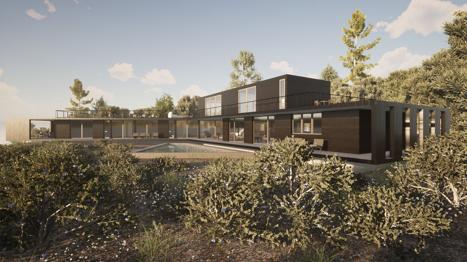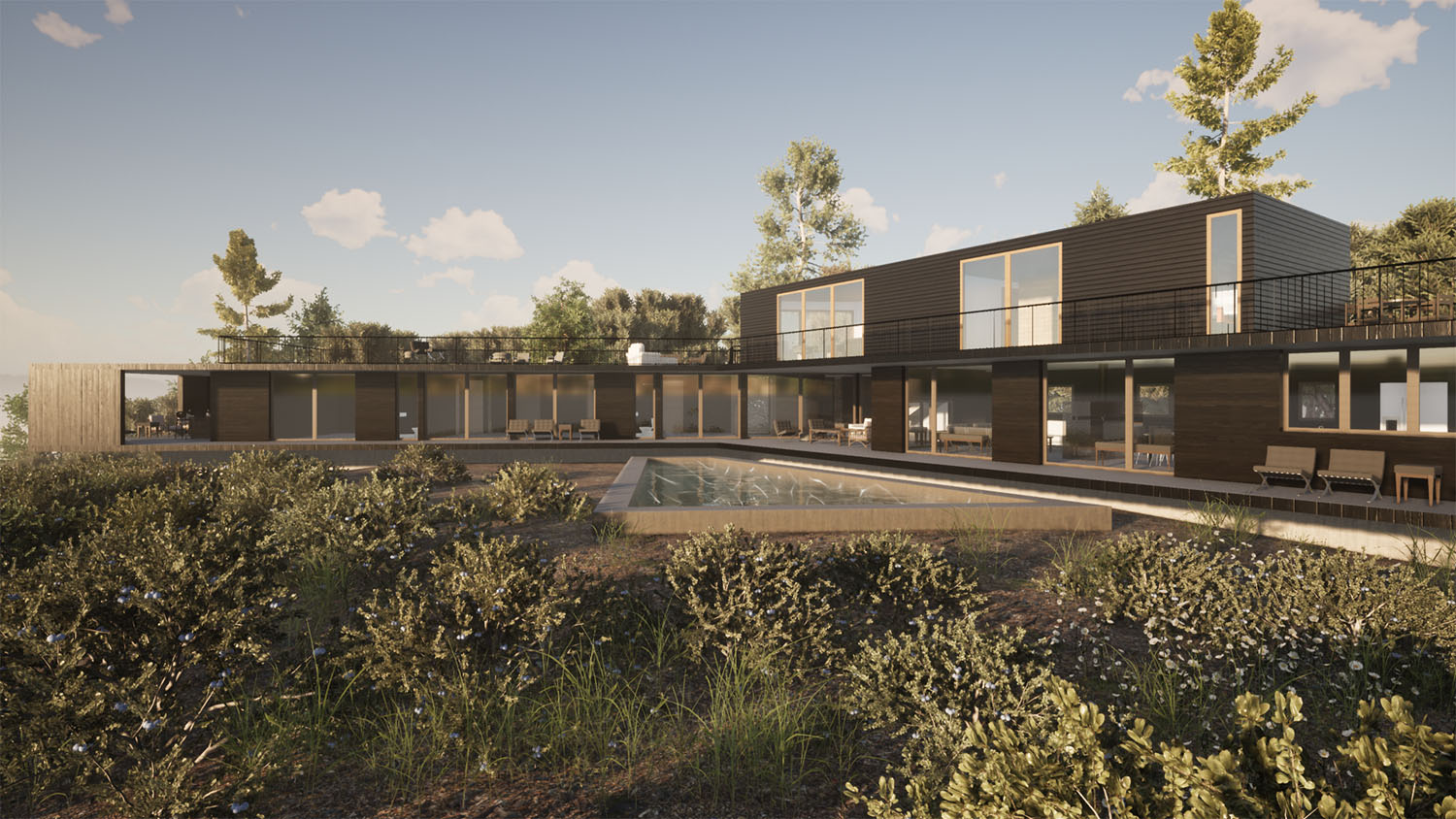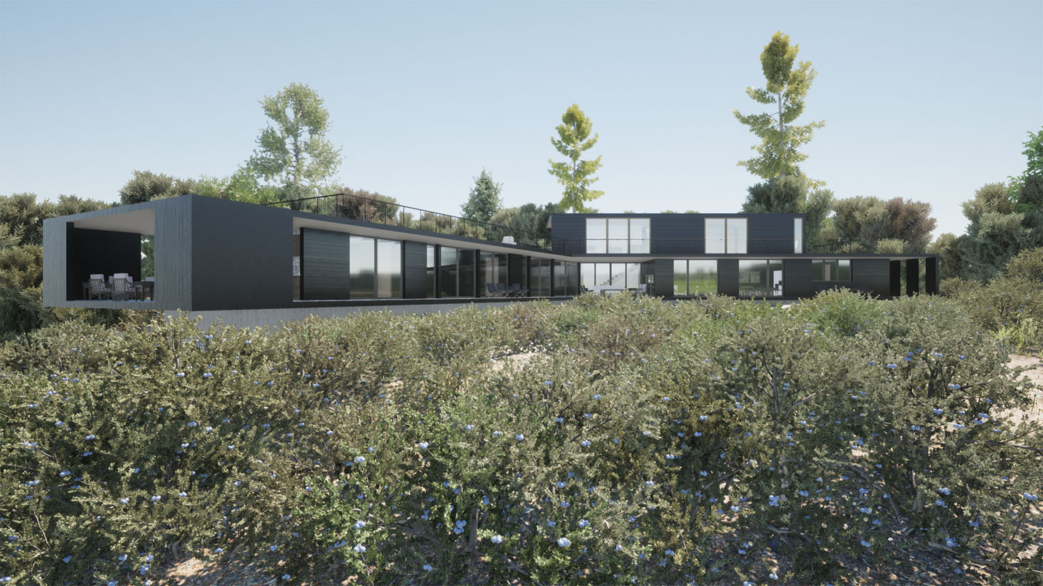 Proyecto modular de 350 m2, el sistema estructural esta definido en madera seca cepillada en dimensiones 6 a 12 pulgadas de terminación. Los muros están resueltos en panel SIP APA EST de 114mm. Las terminaciones son porcelanato 8mm, muros pintados, revestimientos en madera. Las ventanas son termopanel 5-10-5