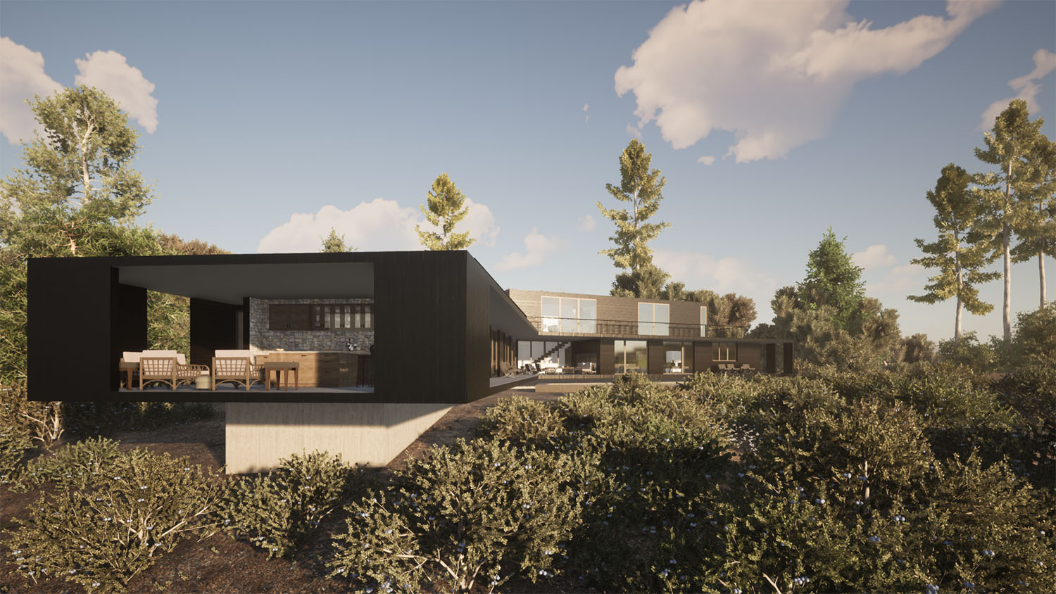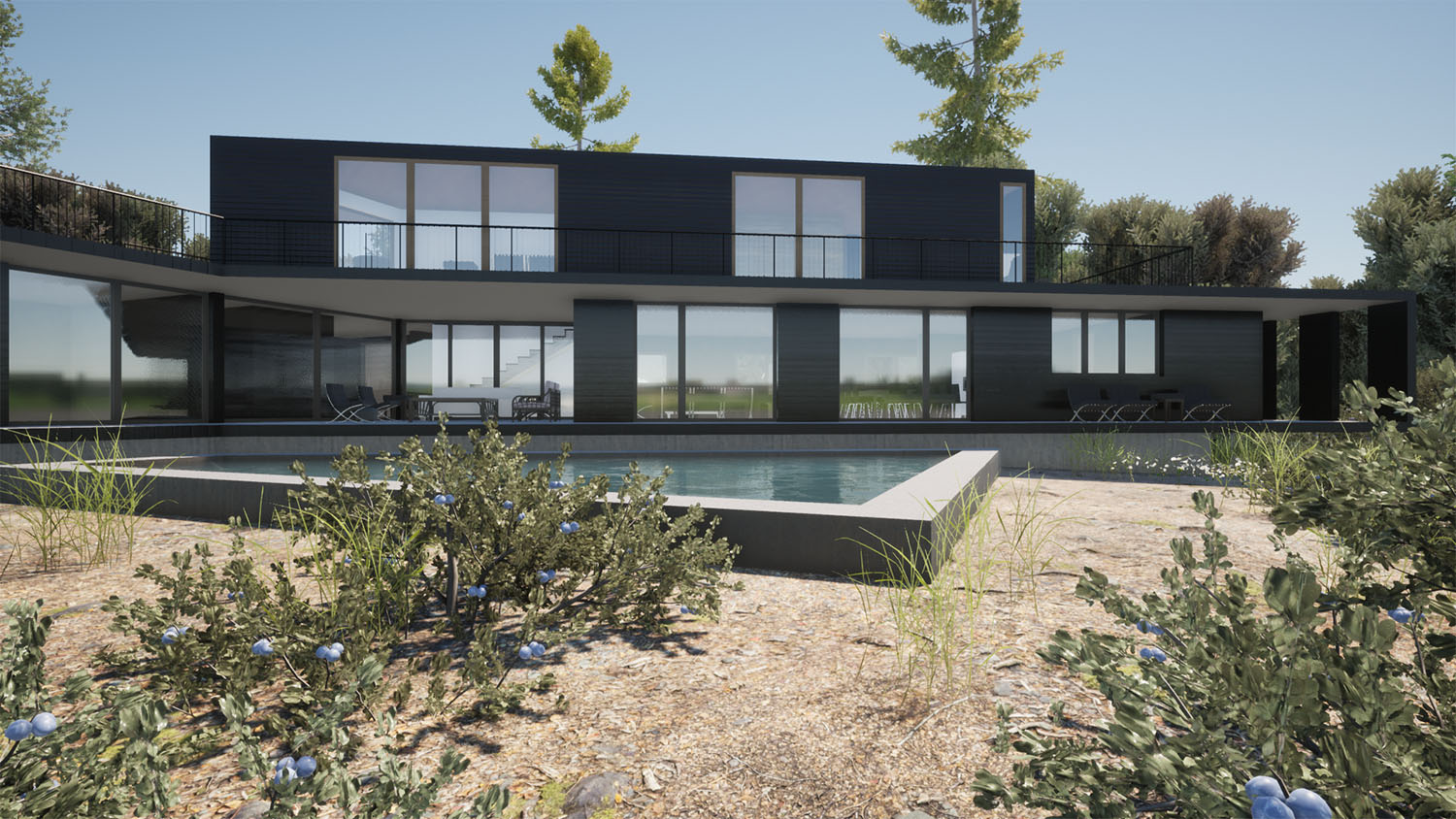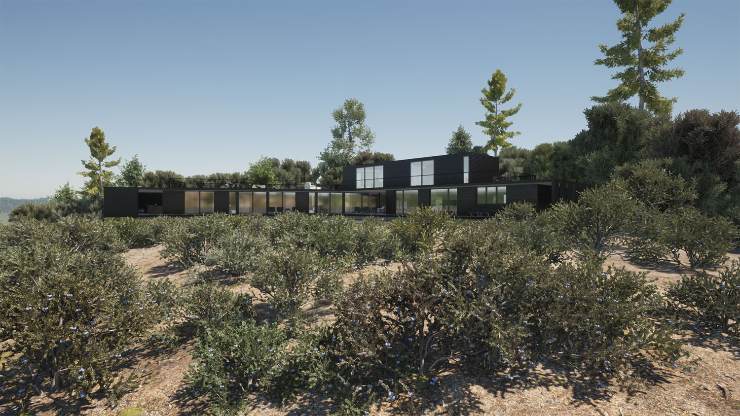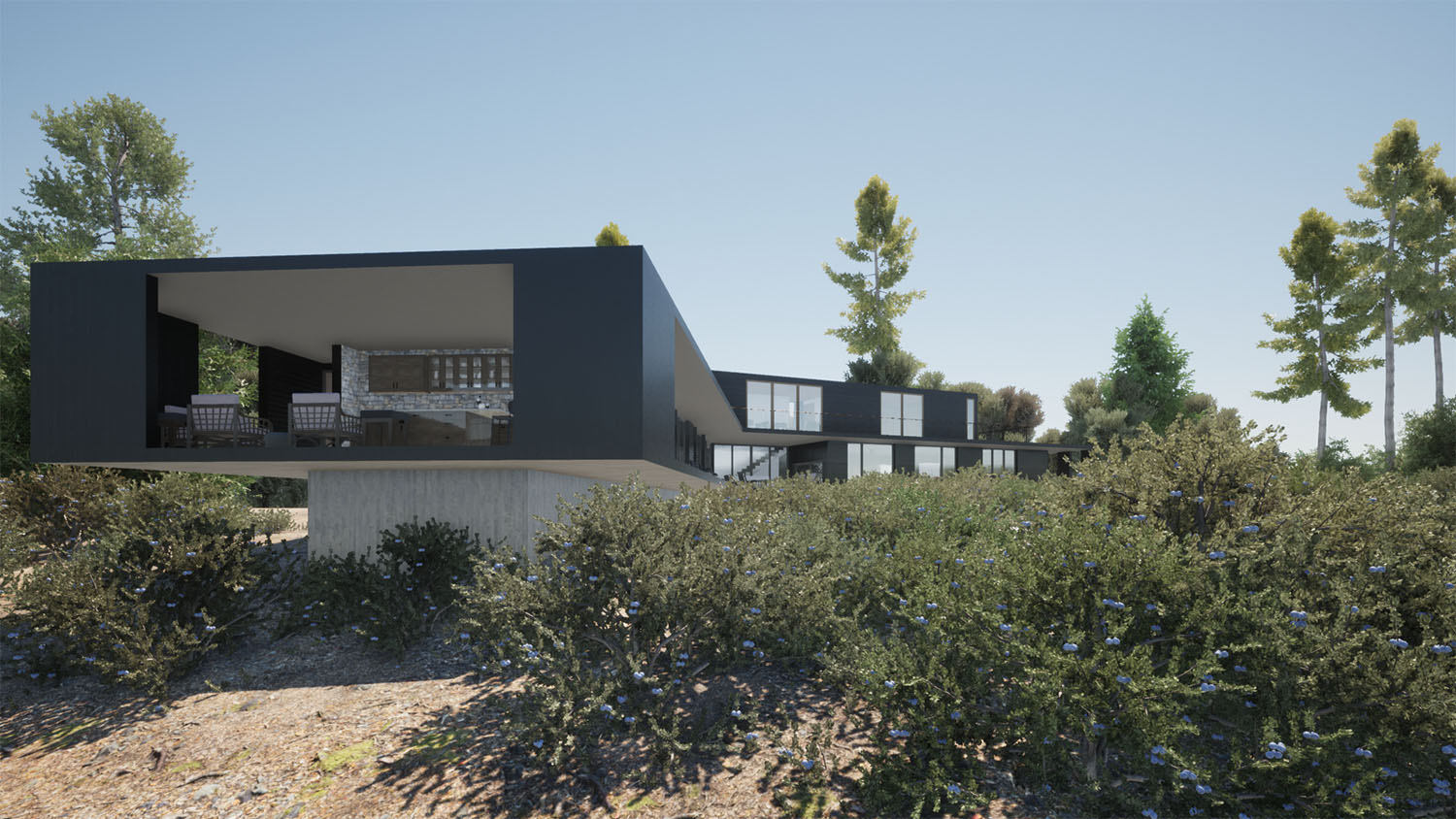 Proyecto modular de 350 m2, el sistema estructural esta definido en madera seca cepillada en dimensiones 6 a 12 pulgadas de terminación. Los muros están resueltos en panel SIP APA EST de 114mm. Las terminaciones son porcelanato 8mm, muros pintados, revestimientos en madera. Las ventanas son termopanel 5-10-5