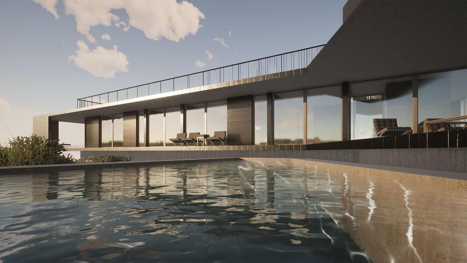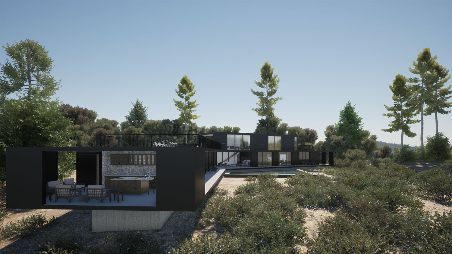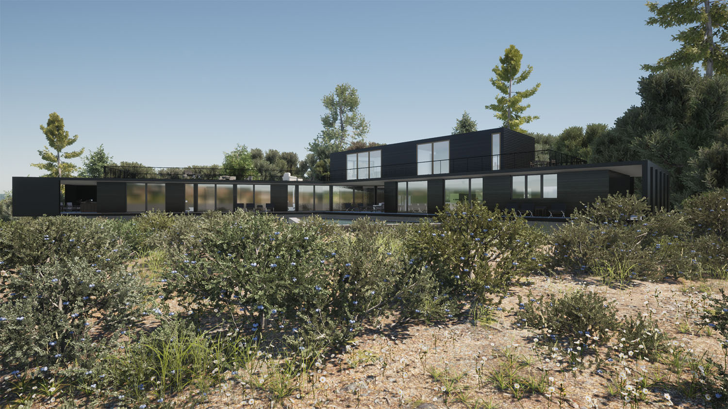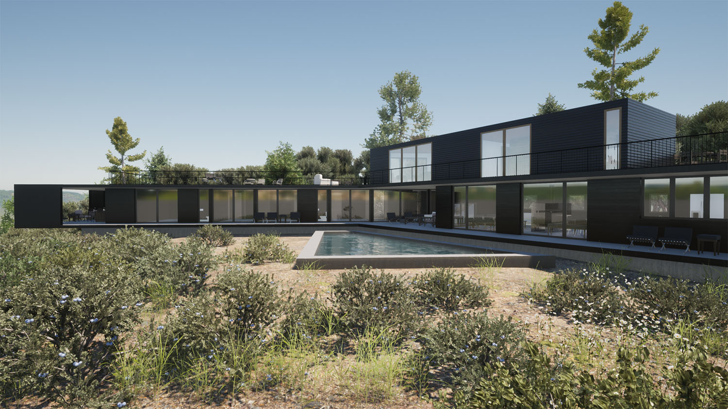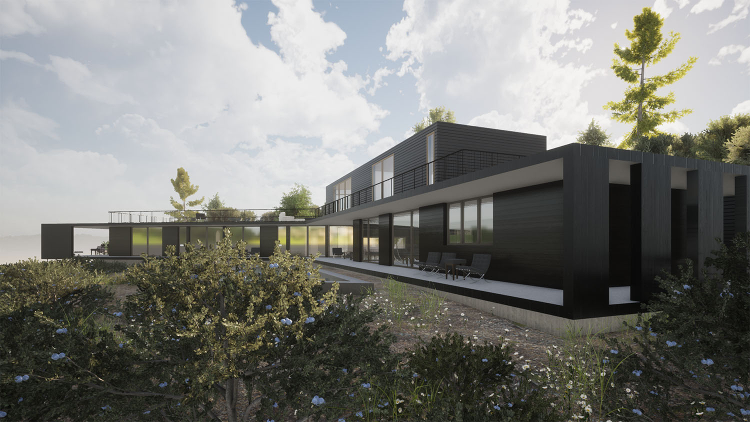 Proyecto modular de 350 m2, el sistema estructural esta definido en madera seca cepillada en dimensiones 6 a 12 pulgadas de terminación. Los muros están resueltos en panel SIP APA EST de 114mm. Las terminaciones son porcelanato 8mm, muros pintados, revestimientos en madera. Las ventanas son termopanel 5-10-5