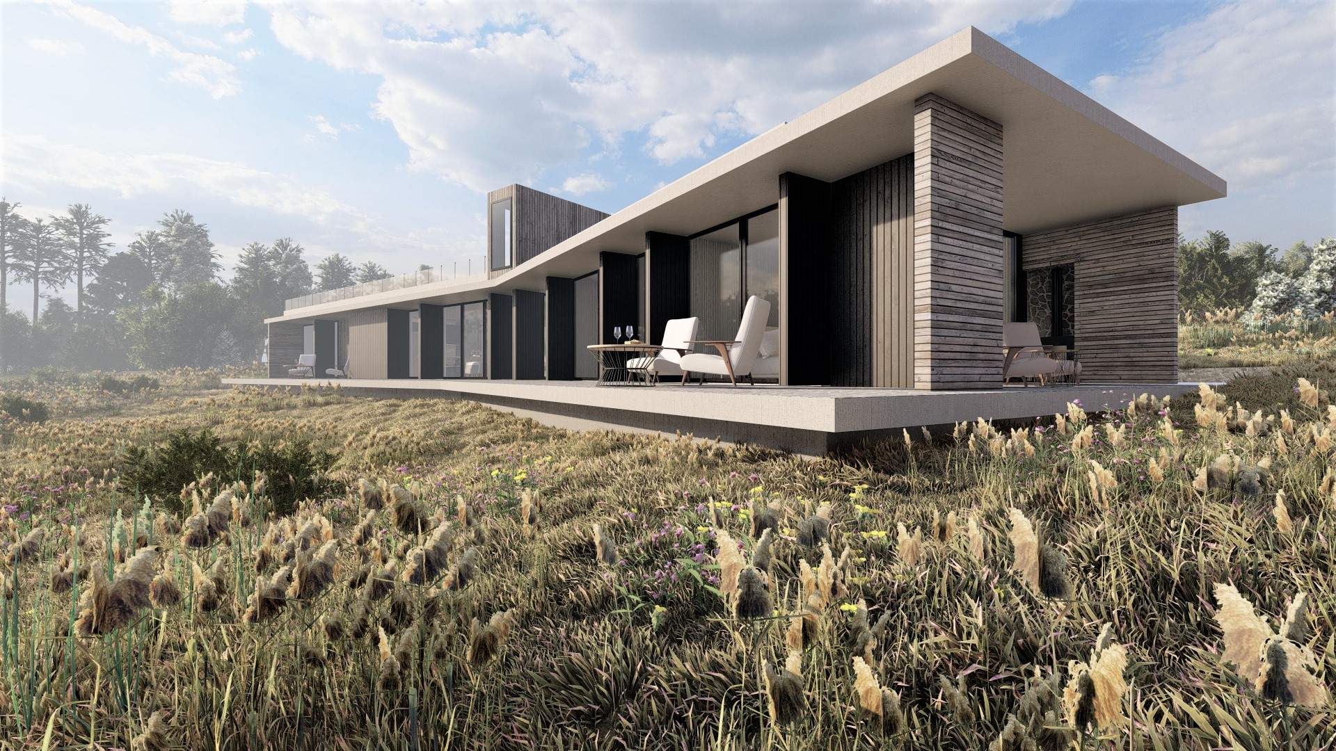 Proyecto diseñado en hormigón armado, con terminaciones finas en madera. Los muros están resueltos con perfiles metálicos, columnas y machones de hormigón armado e = 0,20 mts, tabiquería en paneles SIP de 162mm. Las terminaciones son porcelanato 8mm, muros pintados, revestimientos en madera. Las ventanas son termopanel 5-10-5.