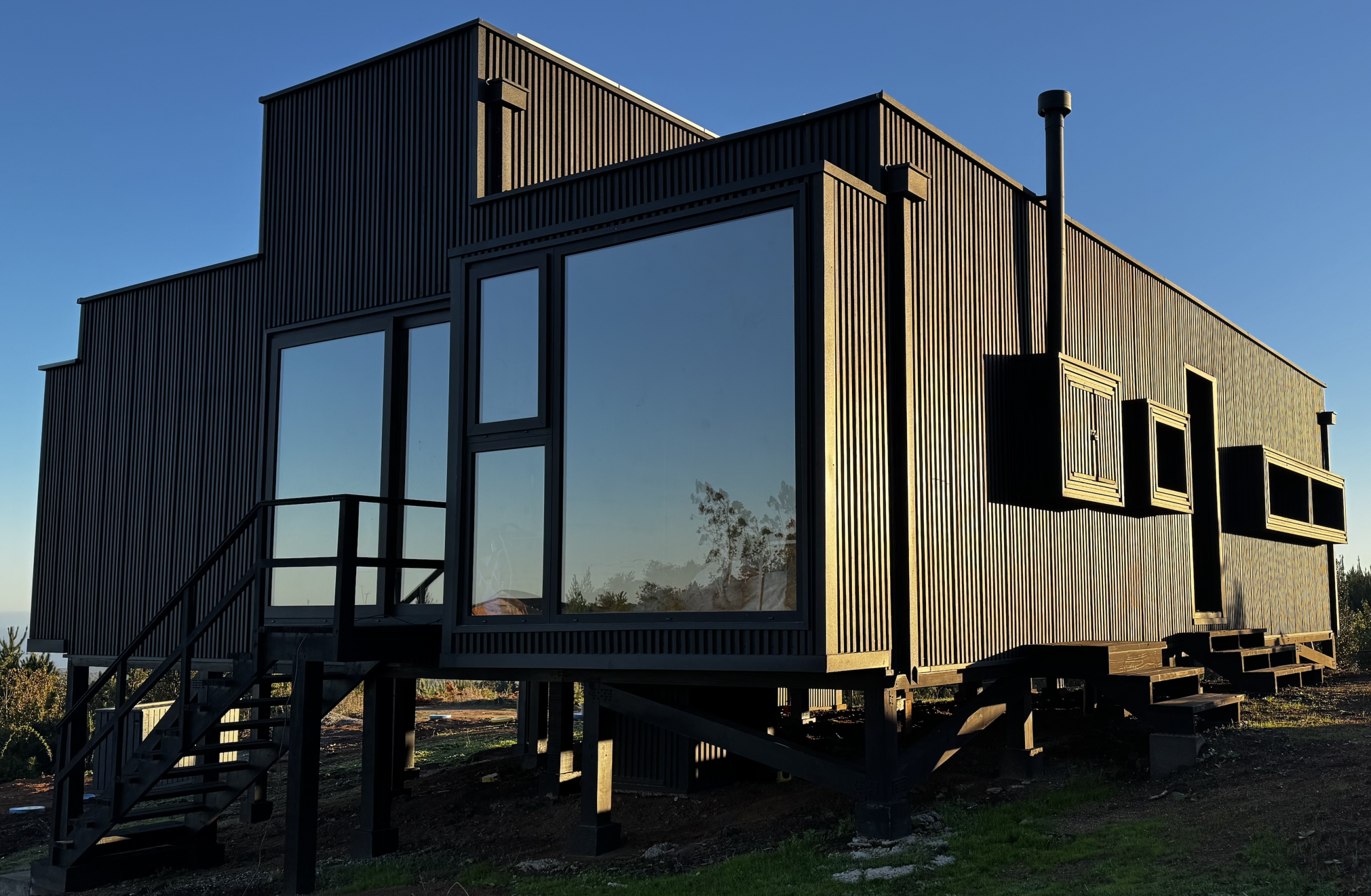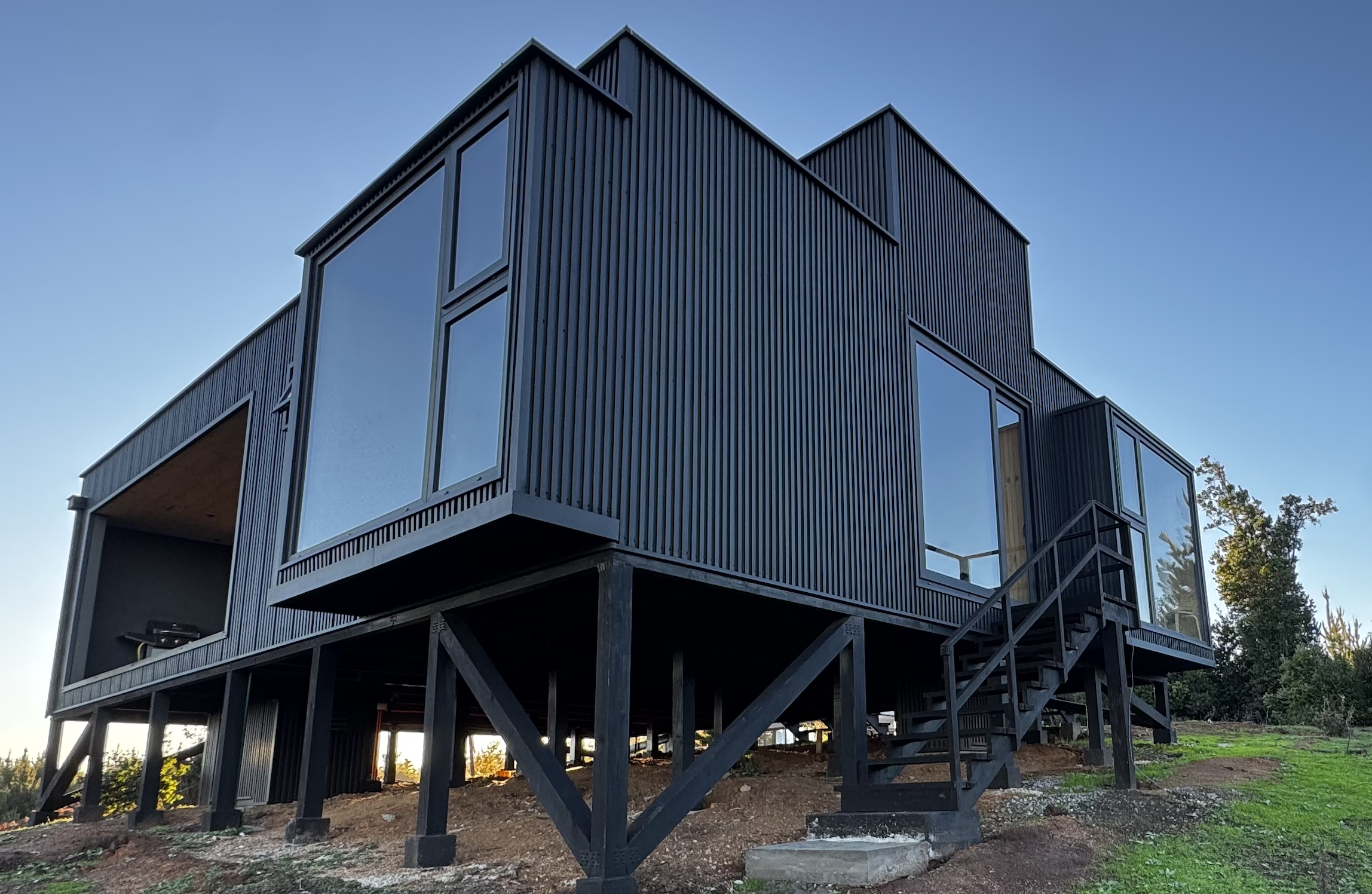 Proyecto modular de 200 m2, el sistema estructural esta definido en madera seca cepillada en dimensiones 6 a 12 pulgadas de terminación. Los muros están resueltos en panel SIP APA EST de 114mm. Las terminaciones son porcelanato 8mm, muros pintados, revestimientos en madera. Las ventanas son termopanel 5-10-5