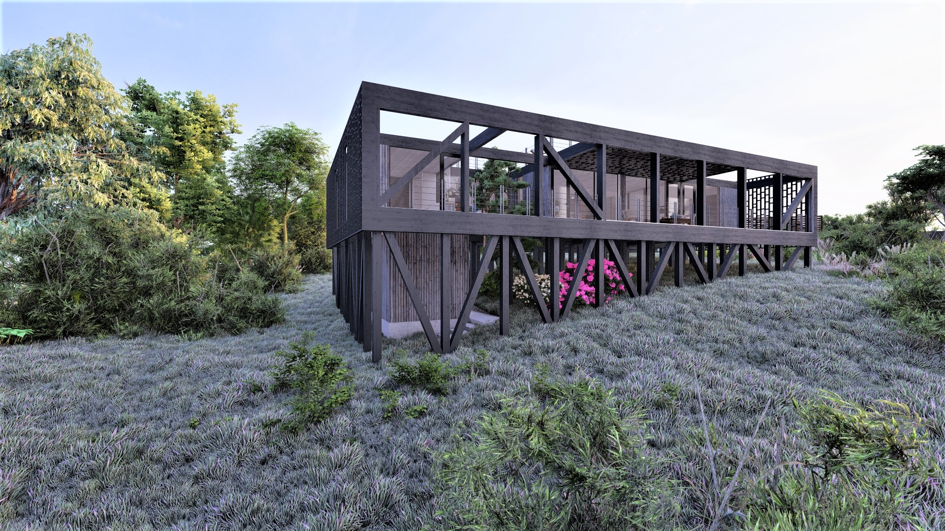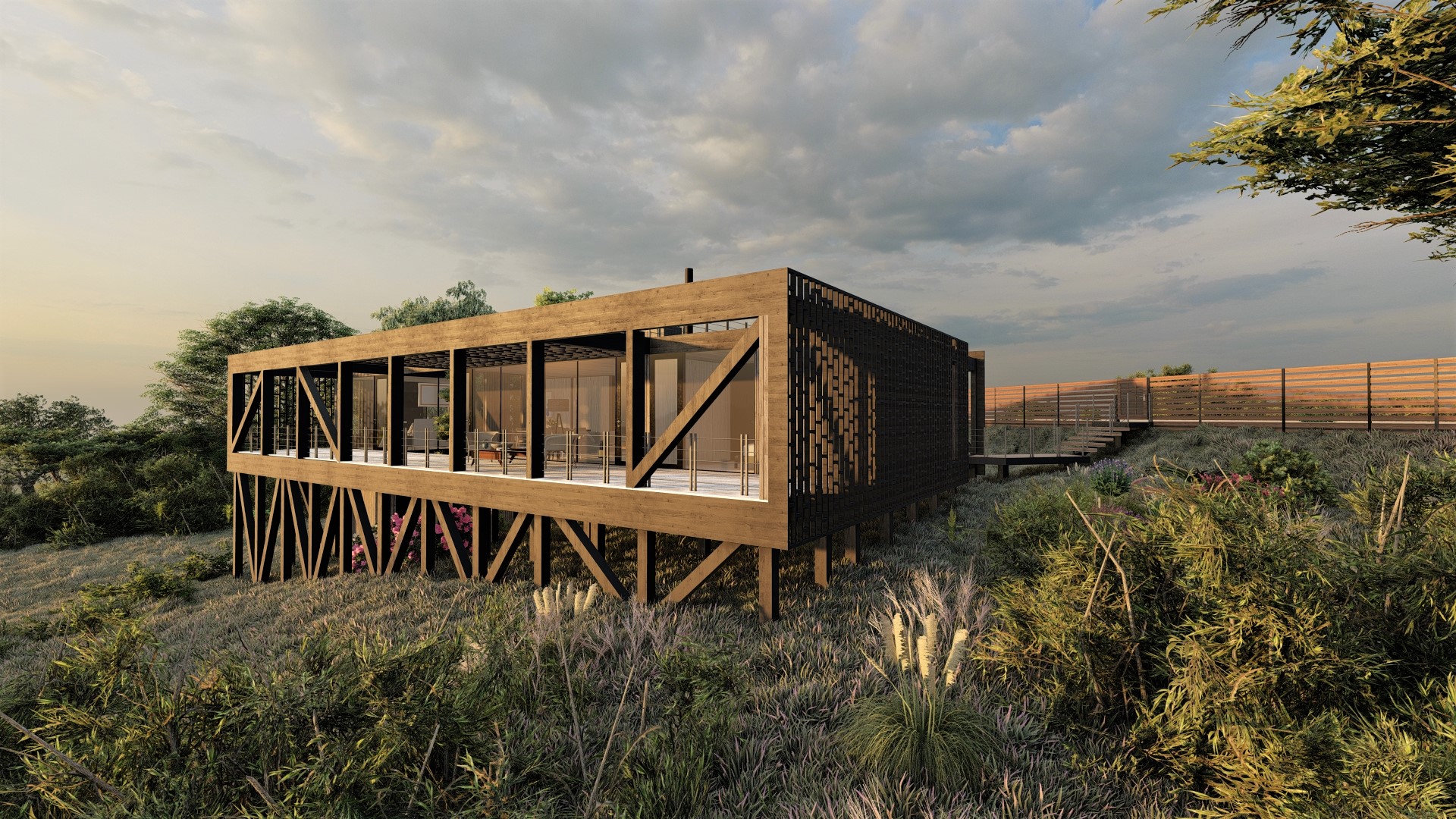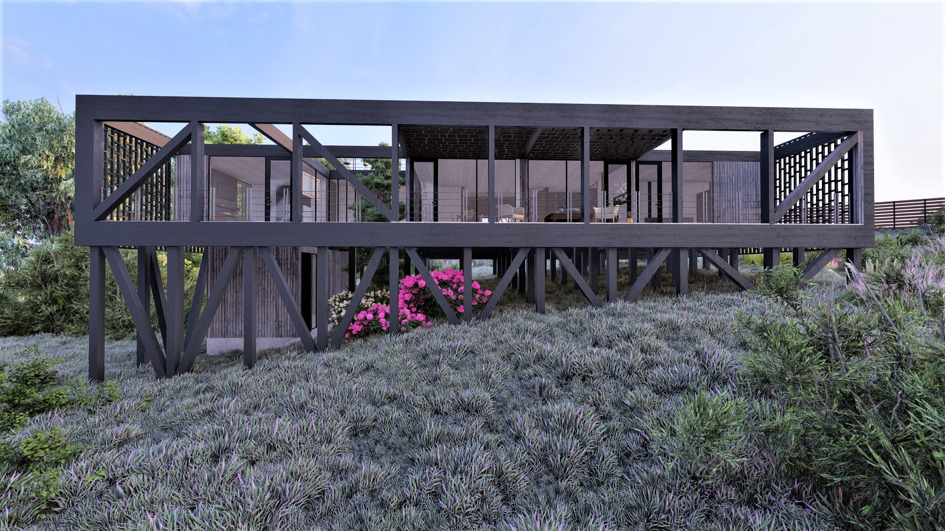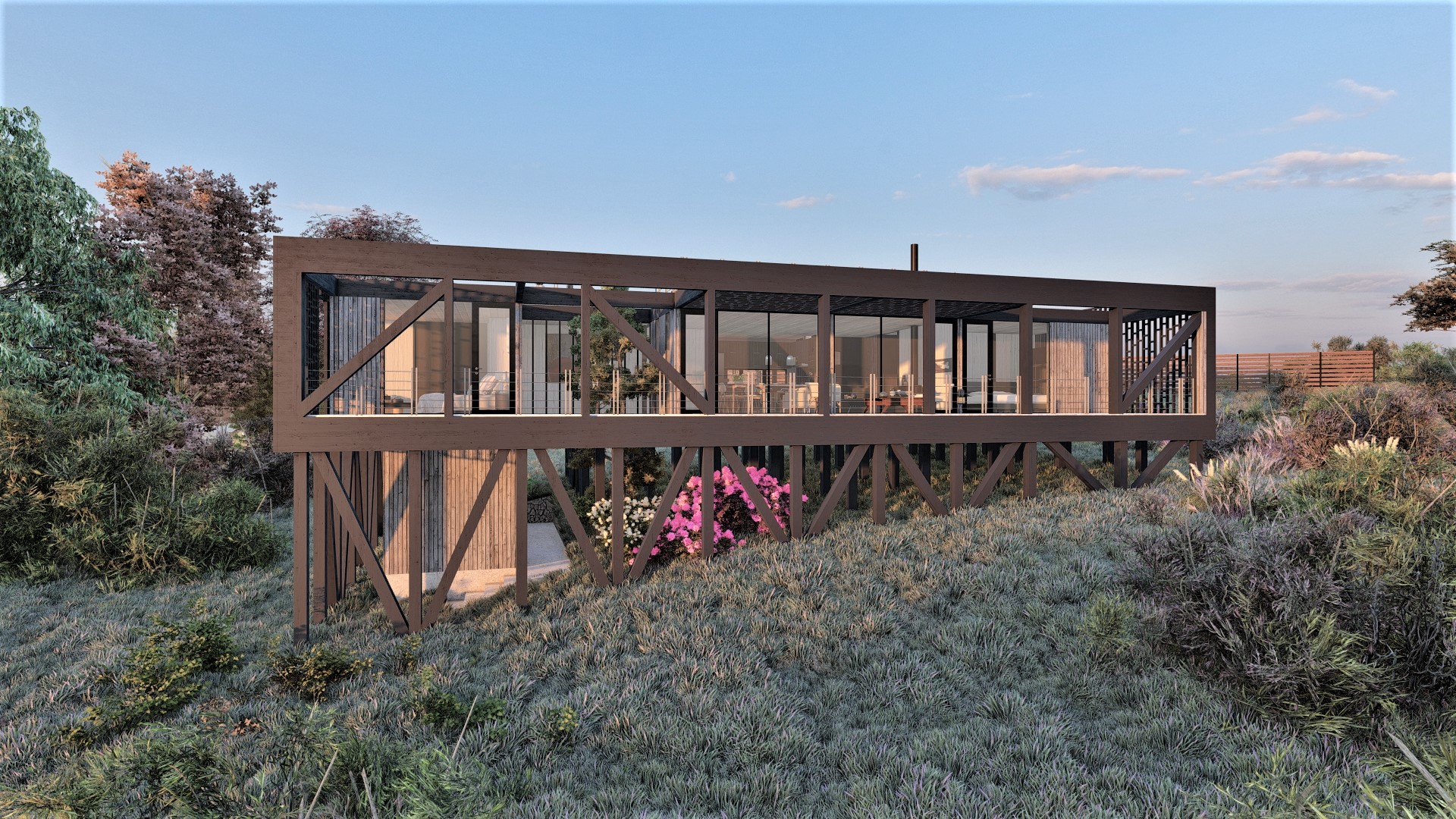 Proyecto de 110 m2, el sistema estructural esta definido en madera seca cepillada en dimensiones 6 a 12 pulgadas de terminación. Los muros están resueltos en panel SIP APA EST de 114mm. Las terminaciones son porcelanato 8mm, muros pintados, revestimientos en madera. Las ventanas son termopanel 5-10-5