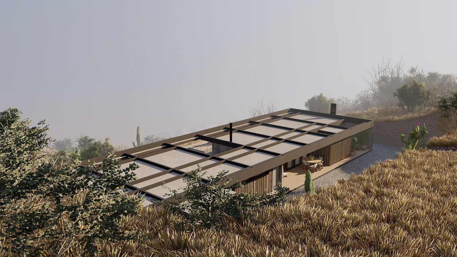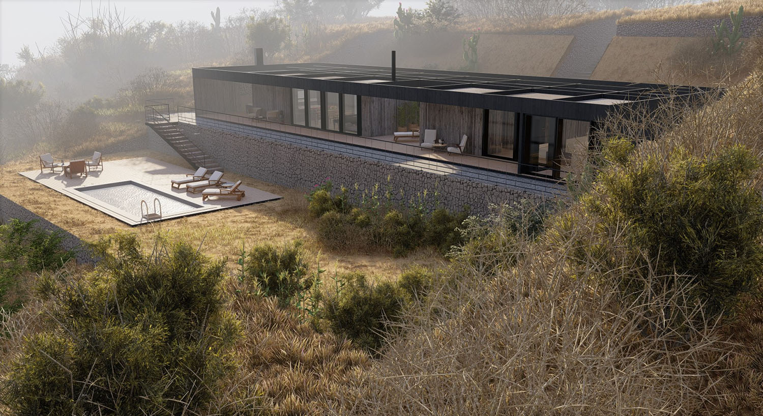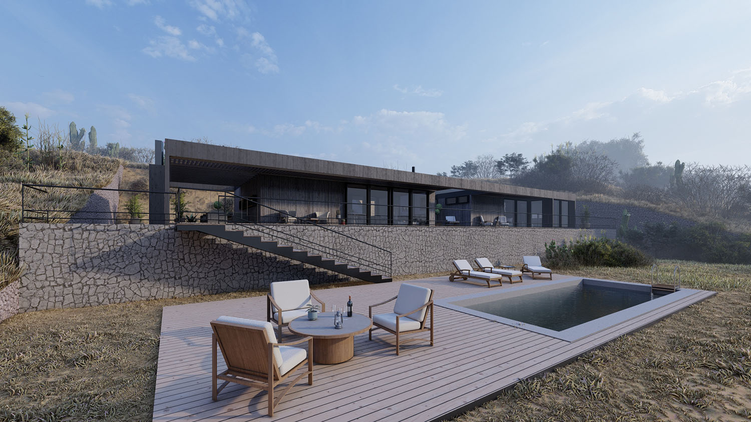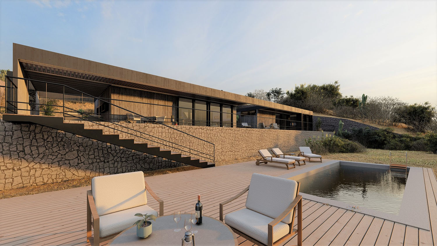 Proyecto diseñado en terrazas debido a las condiciones topográficas del lugar. La base es en hormigón armado con muros de contención. La casa en sí, esta diseñada con pilares, columnas y vigas de acero, y terminaciones de muro y tabiquería con sistema Metalcom. Los revestimientos exteriores están resueltos en madera, piedra y hormigón a la vista. Las ventanas son termopanel 5-10-5. Los pisos son de porcelanato, cemento micro vibrado y baldosas córdova.