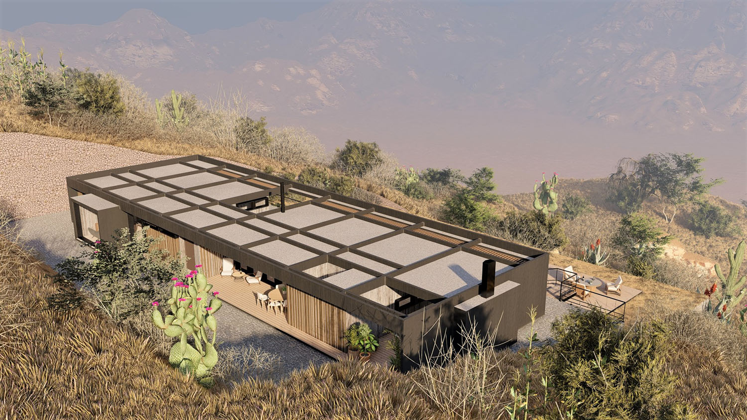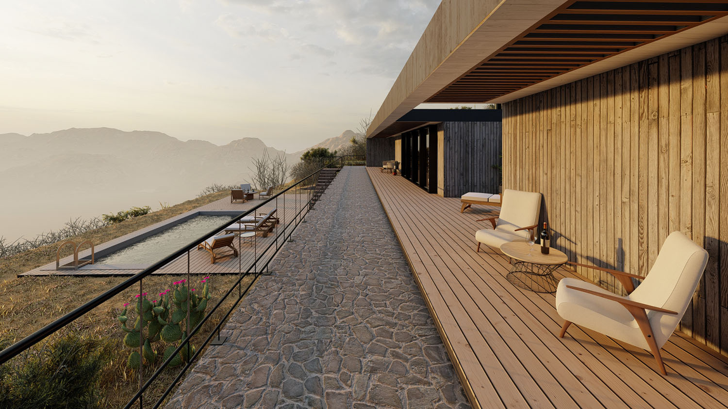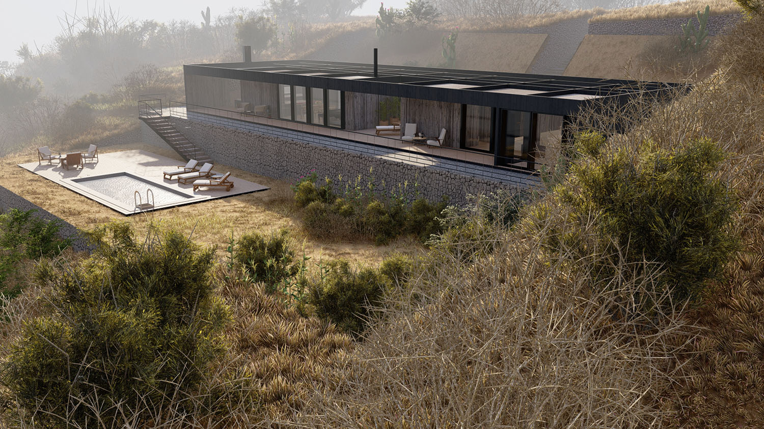 Proyecto diseñado en terrazas debido a las condiciones topográficas del lugar. La base es en hormigón armado con muros de contención. La casa en sí, esta diseñada con pilares, columnas y vigas de acero, y terminaciones de muro y tabiquería con sistema Metalcom. Los revestimientos exteriores están resueltos en madera, piedra y hormigón a la vista. Las ventanas son termopanel 5-10-5. Los pisos son de porcelanato, cemento micro vibrado y baldosas córdova.