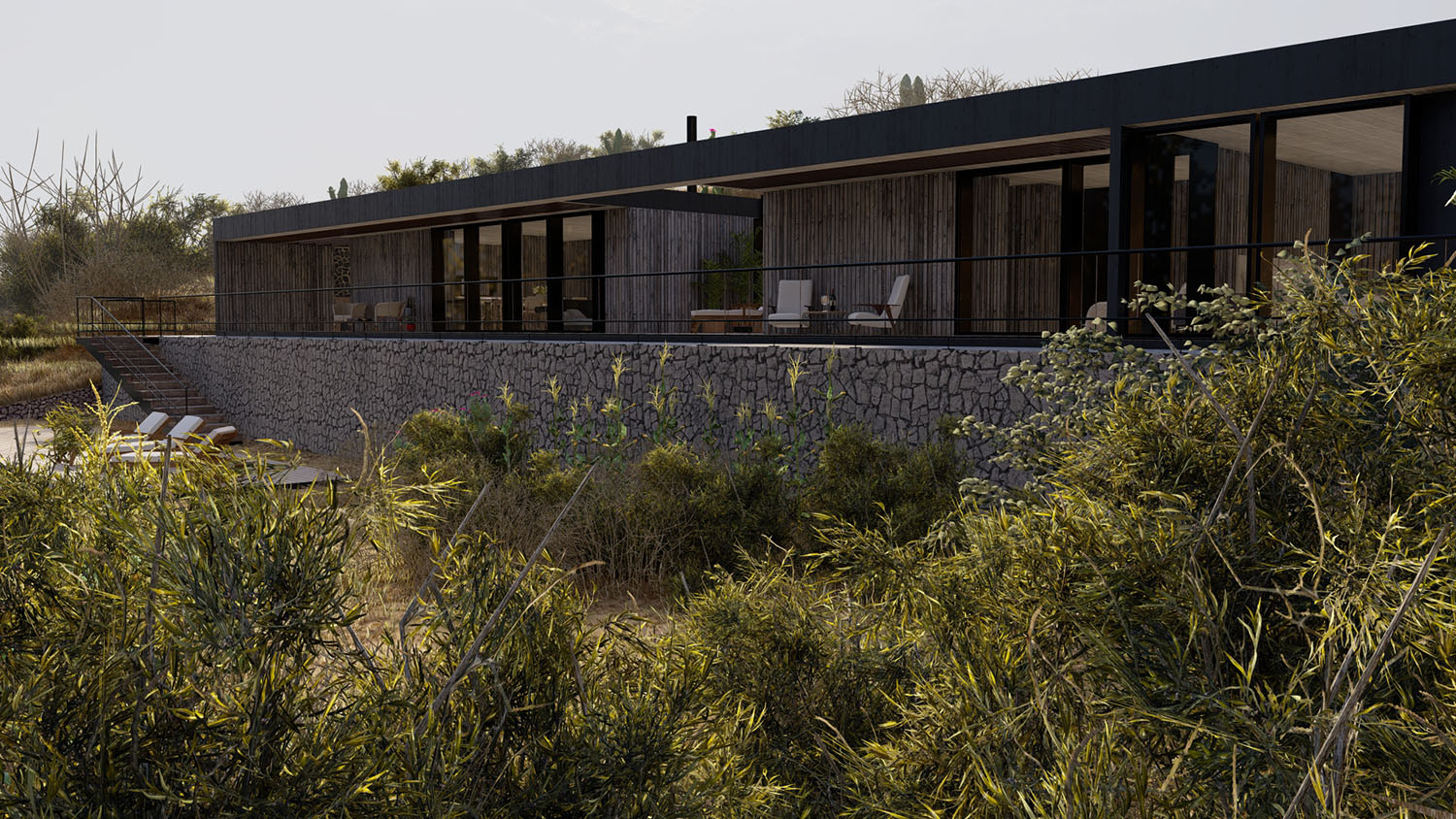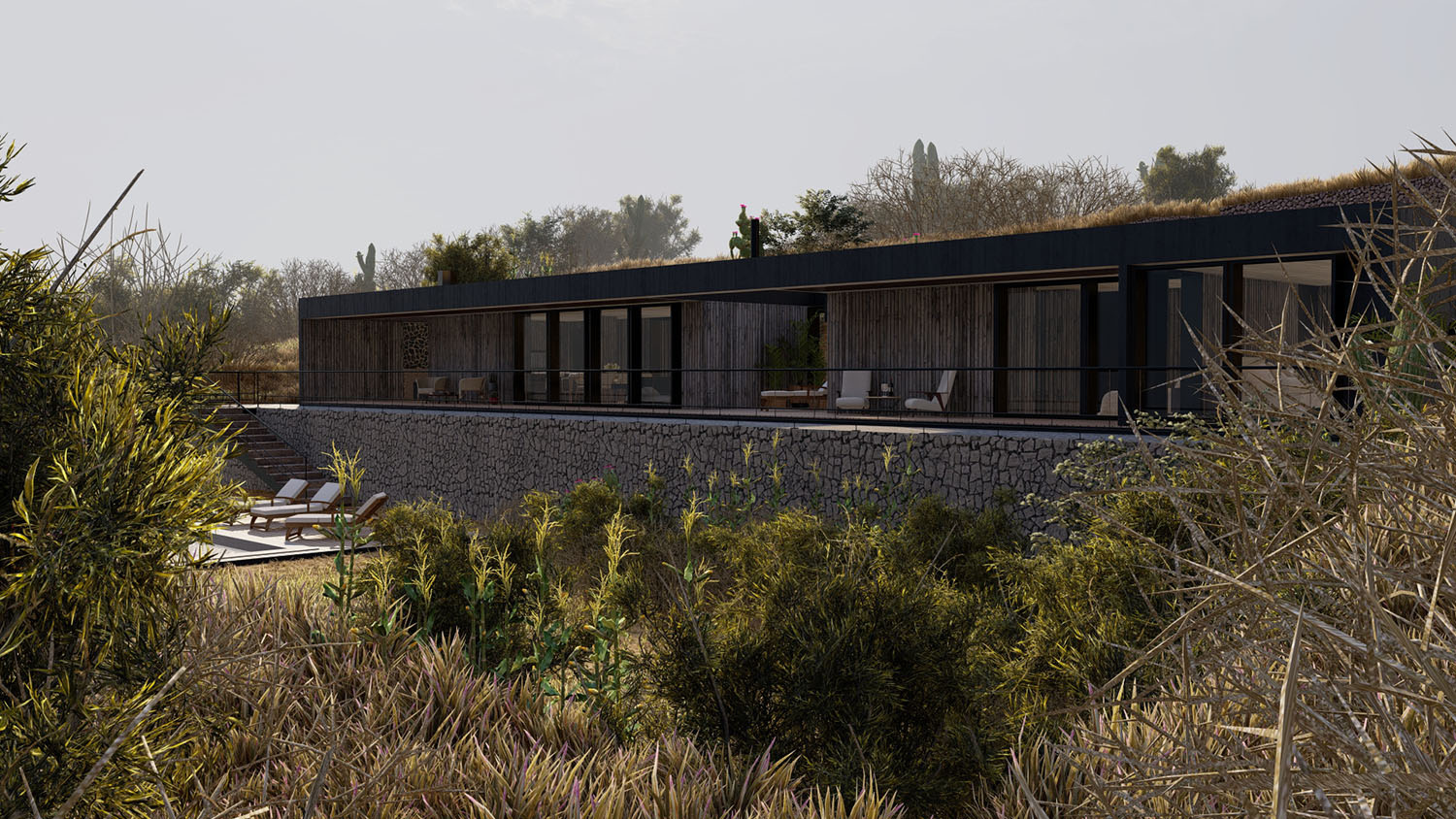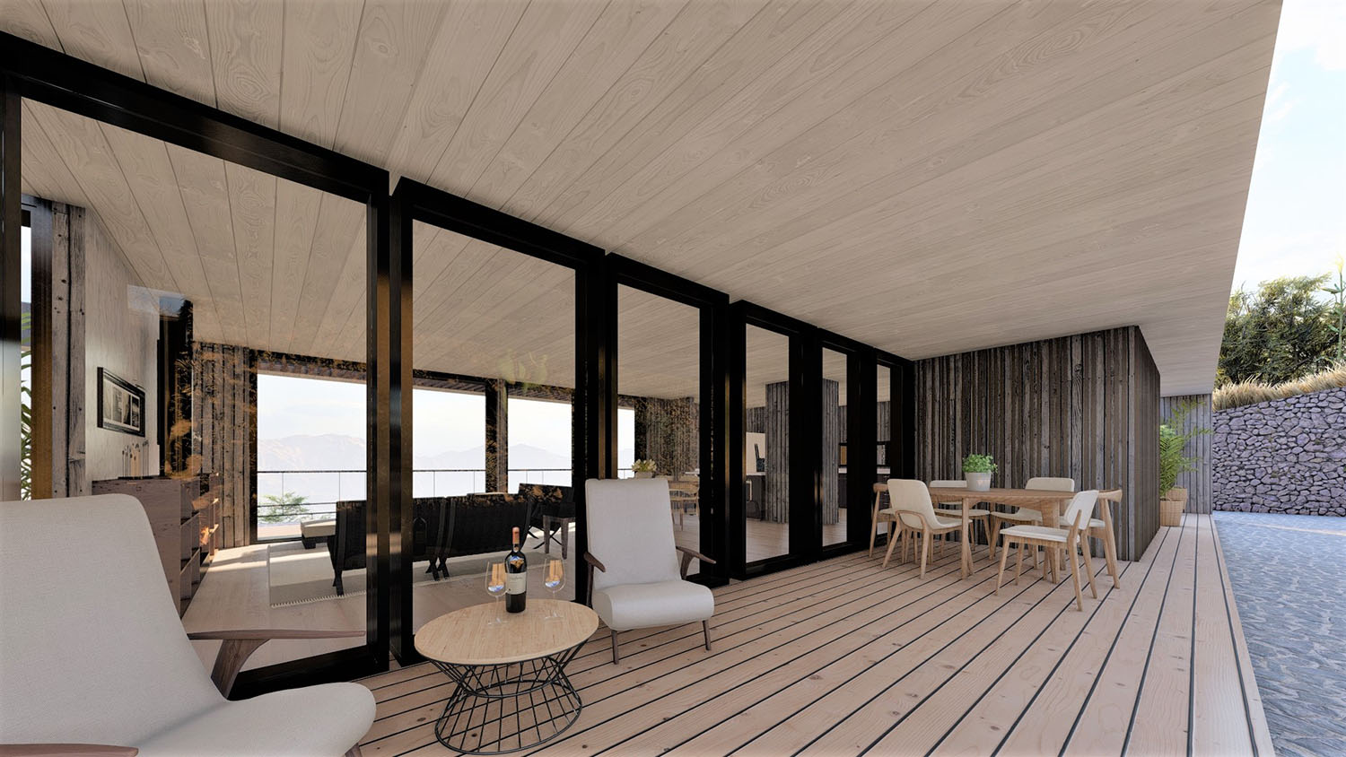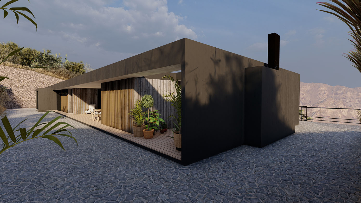 Proyecto diseñado en terrazas debido a las condiciones topográficas del lugar. La base es en hormigón armado con muros de contención. La casa en sí, esta diseñada con pilares, columnas y vigas de acero, y terminaciones de muro y tabiquería con sistema Metalcom. Los revestimientos exteriores están resueltos en madera, piedra y hormigón a la vista. Las ventanas son termopanel 5-10-5. Los pisos son de porcelanato, cemento micro vibrado y baldosas córdova.