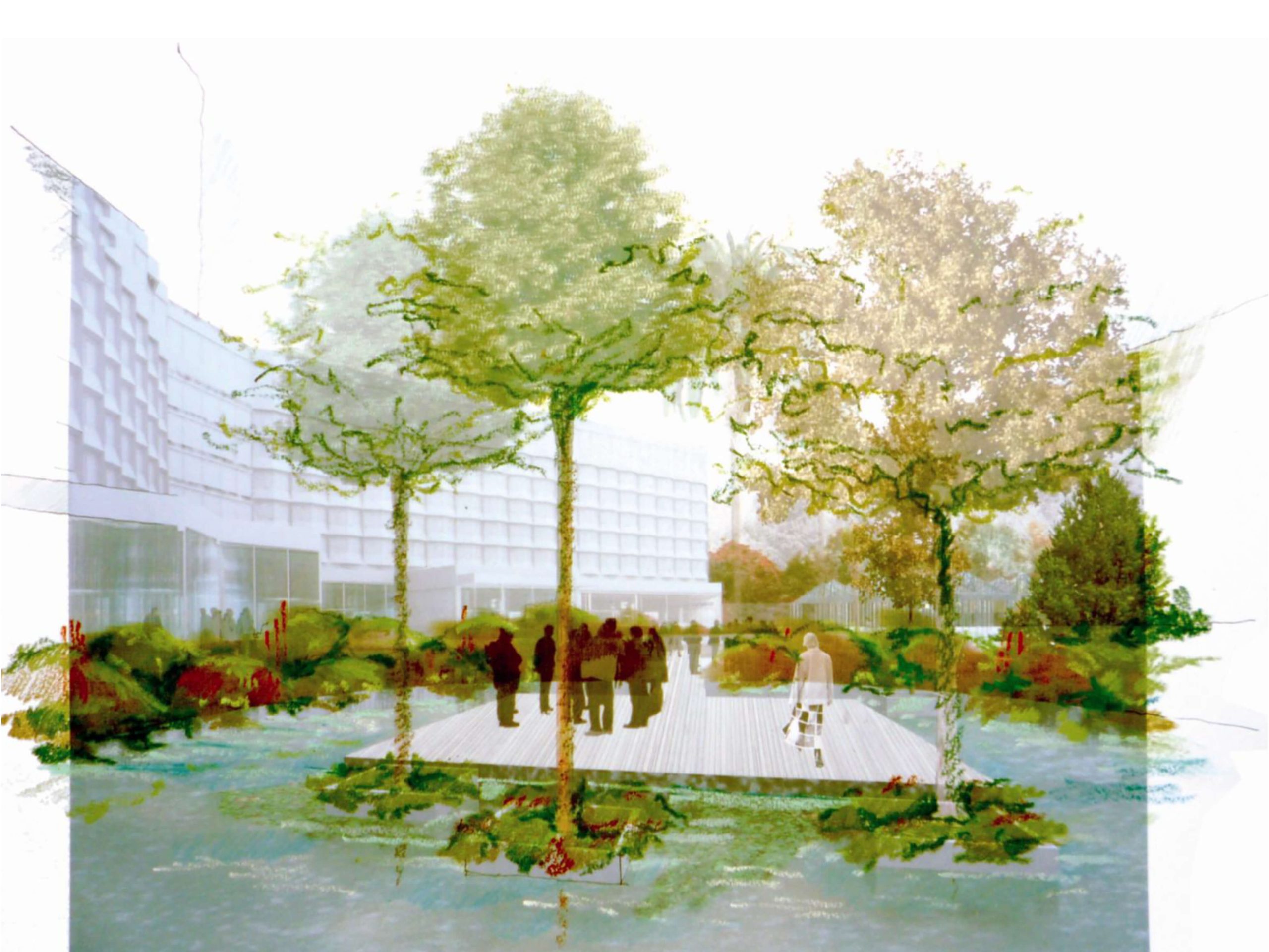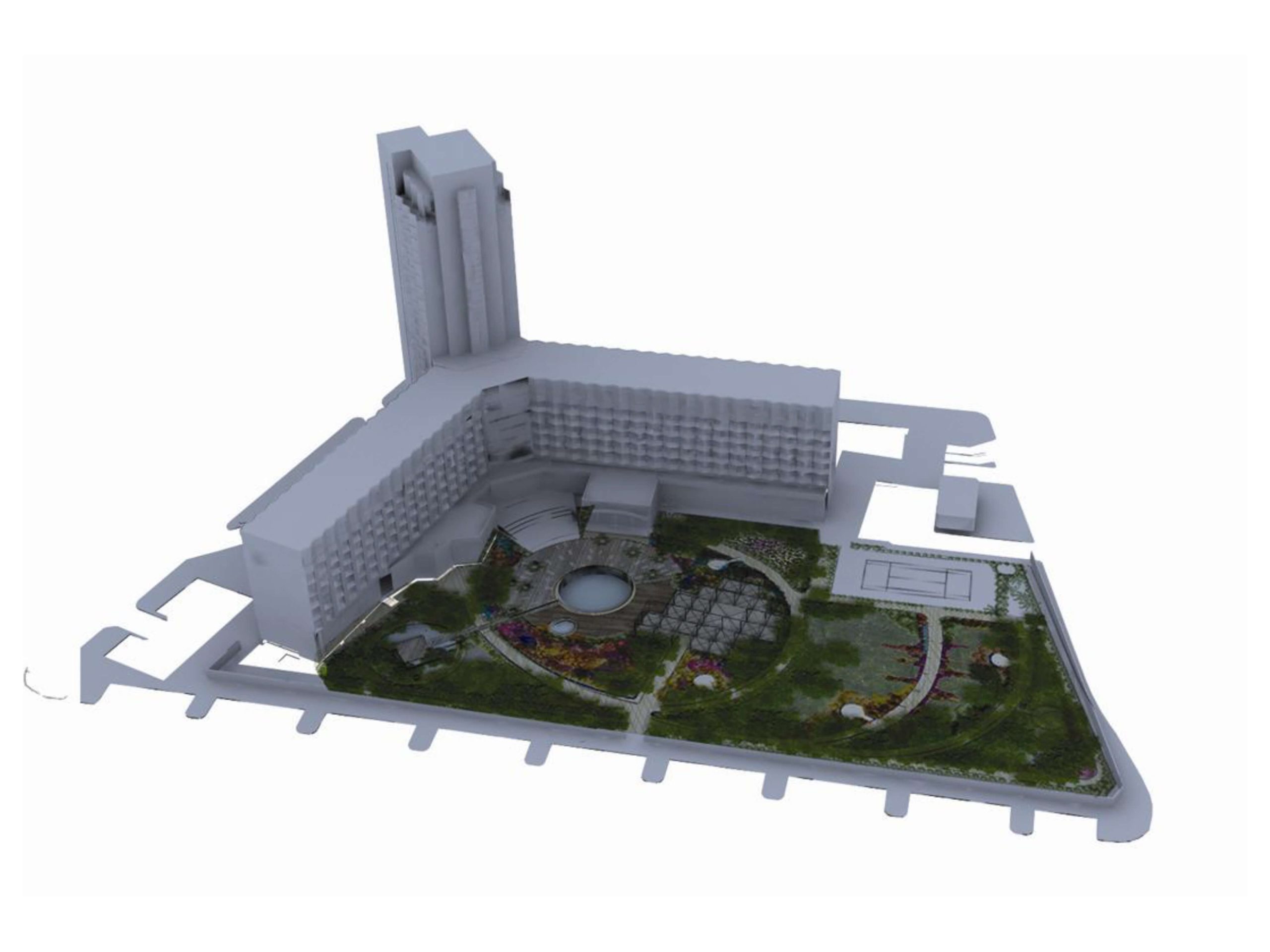 Proyecto de paisajismo y diseño de áreas comunes exteriores, conformados por una geometría circular la cual permite recorrer todos los espacios, comunicándolos entre si por medio de caminerías, jardinerías y decks que se encuentran en el centro con el área de la piscina.